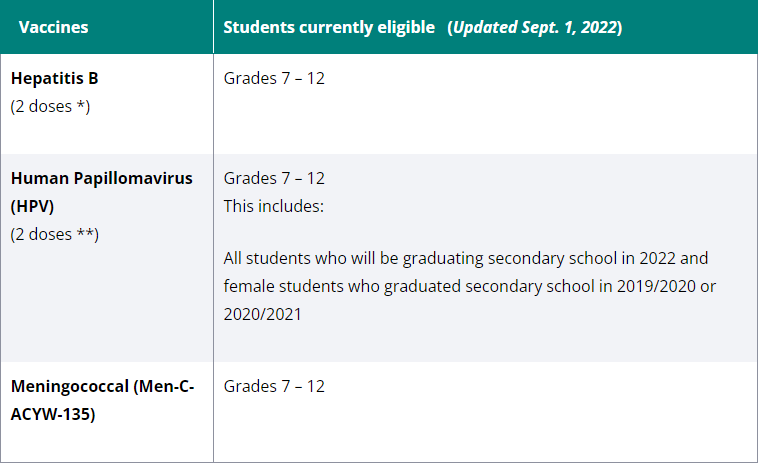 Hepatitis B, HPV, and Meningitis Vaccines for Grade 7/8 Students